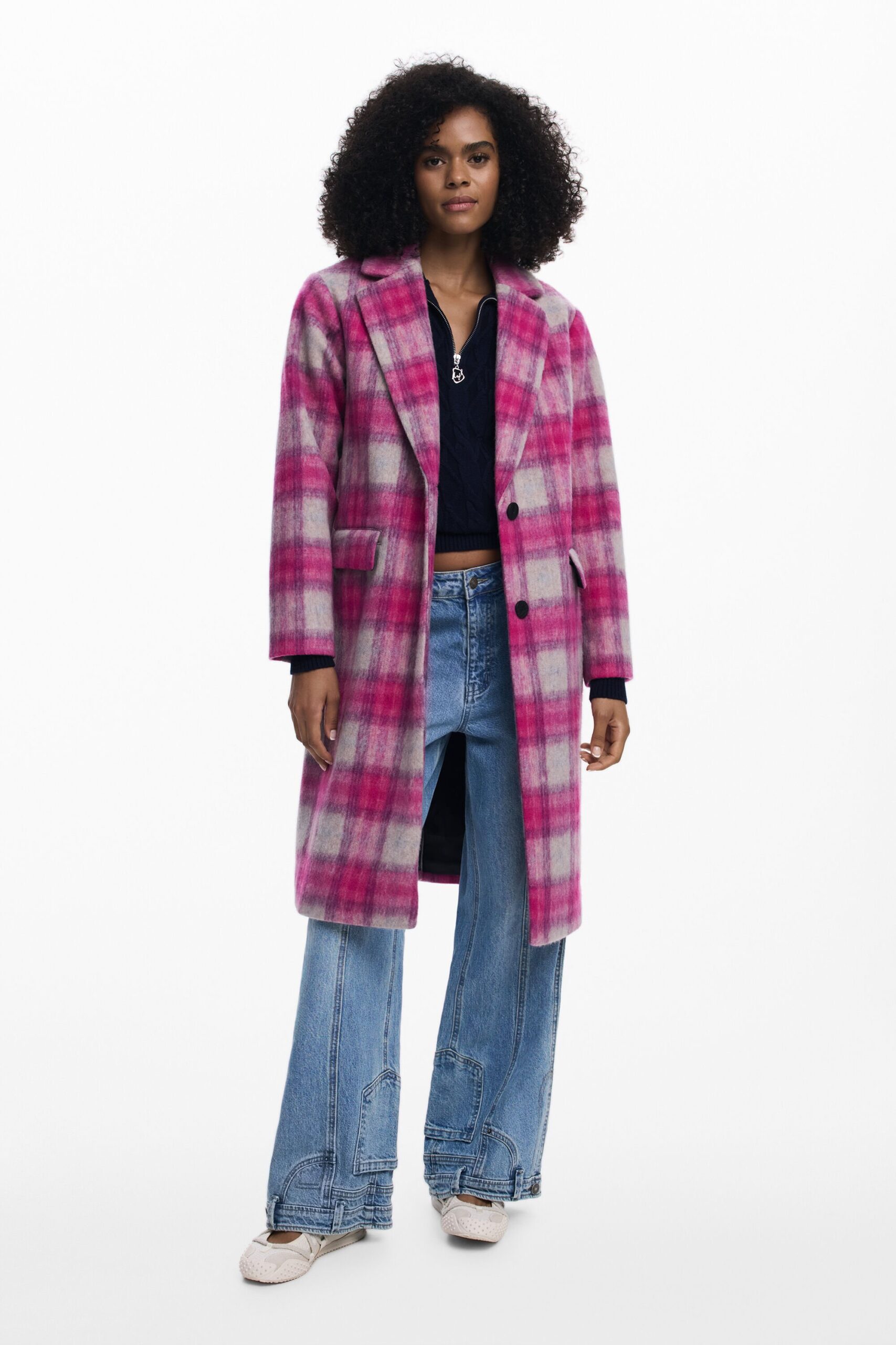 Lange jas, met V-reverskraag, voorzakken en groot tartanpatroon.