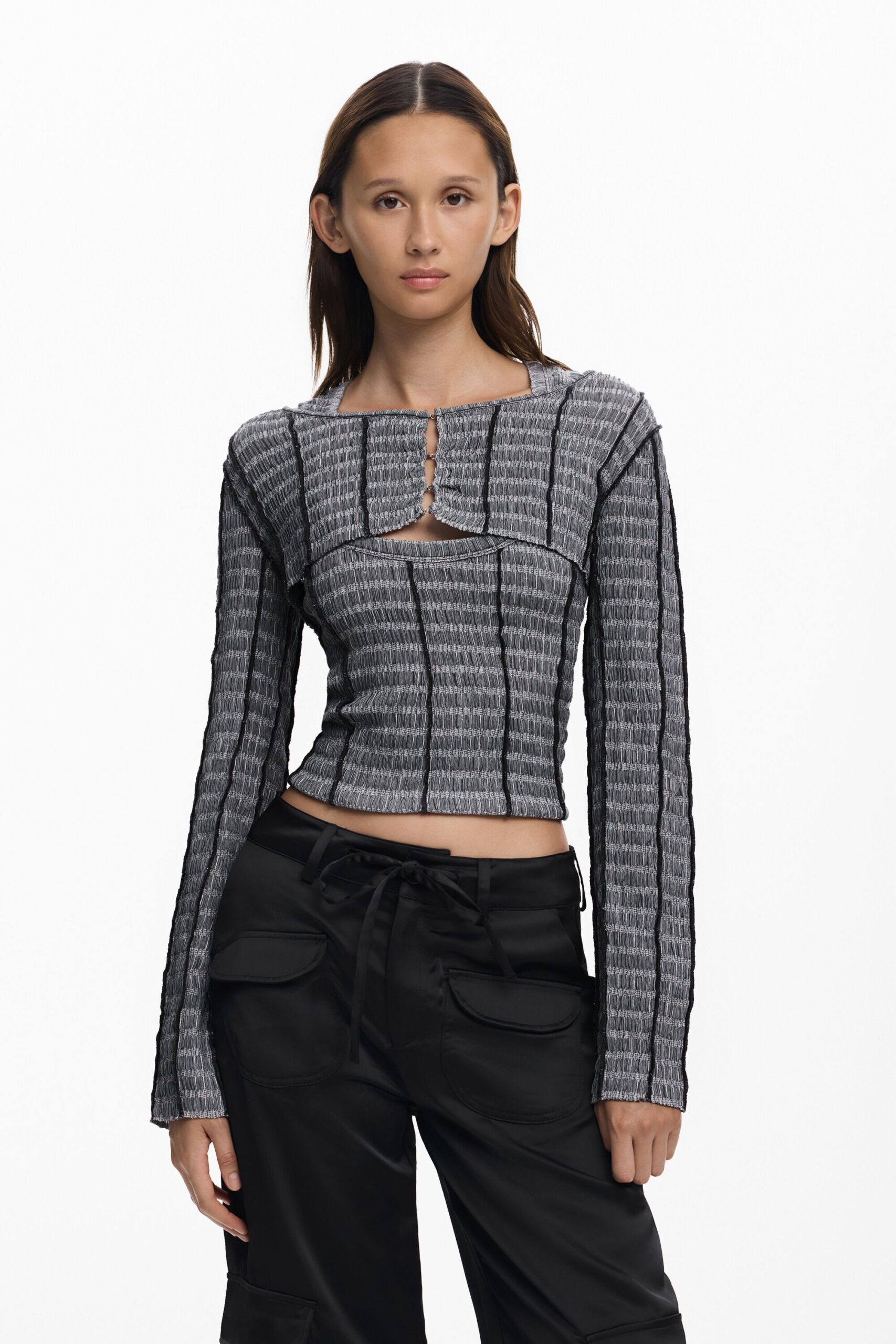 Langarmshirt aus geripptem Stoff, mit enger Passform, rundem Ausschnitt, vorderer Öffnung und abnehmbarem Design.