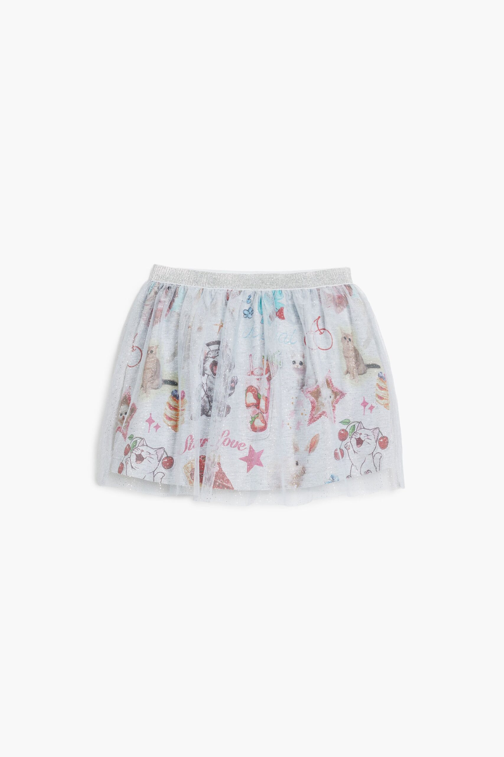 Korte rok bestaande uit meerdere lagen, met tule, elastische tailleband van metallic en print van katten en grappige tekeningen.