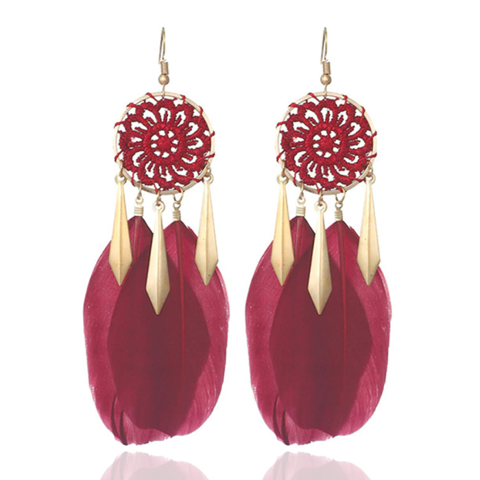 Dromenvanger oorbellen van Deja Jewels met prachtige rode veren.