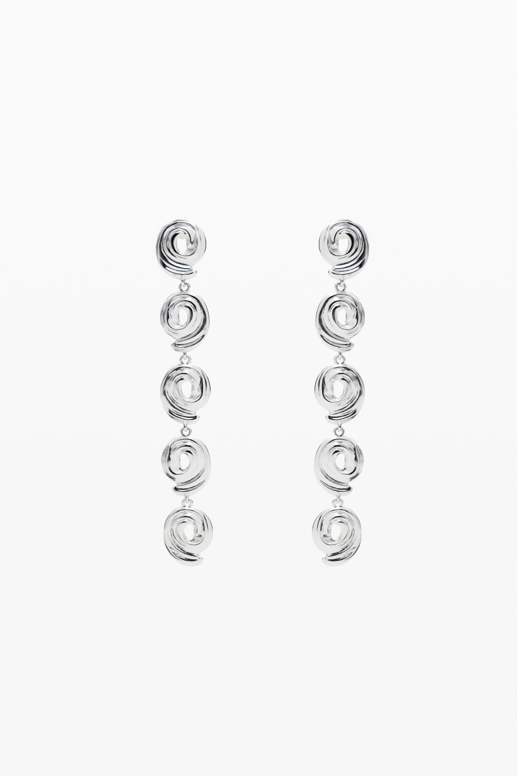 Waterval oorbellen met spiraalvormen in eerste wet zilver van 3 micro inch en druksluiting met pareldetail. Collectie Zalio x Desigual; ontworpen door Gala Meyer.